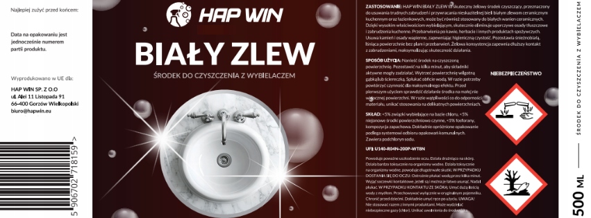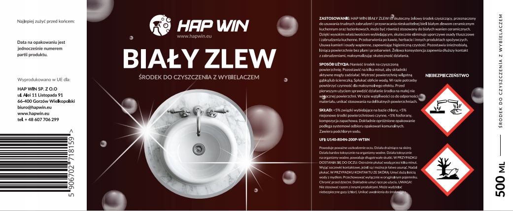 HAP WIN BIAŁY ZLEW to skuteczny żelowy środek czyszczący, przeznaczony do usuwania trudnych zabrudzeń i przywracania nieskazitelnej bieli białym zlewom ceramicznym kuchennym oraz łazienkowych, może być również stosowany do białych wanien ceramicznych. Dzięki wysokim właściwościom wybielającym, skutecznie eliminuje uporczywe osady tłuszczowe i zabrudzenia kuchenne. Przebarwienia po kawie, herbacie i innych produktach spożywczych. Usuwa kamień i osady wapienne, zapewniając higieniczną czystość. Pozostawia śnieżnobiałą, lśniąca powierzchnie bez plam i przebarwień. Żelowa konsystencja zapewnia dłuższy kontakt z zabrudzeniami, maksymalizując skuteczność działania.