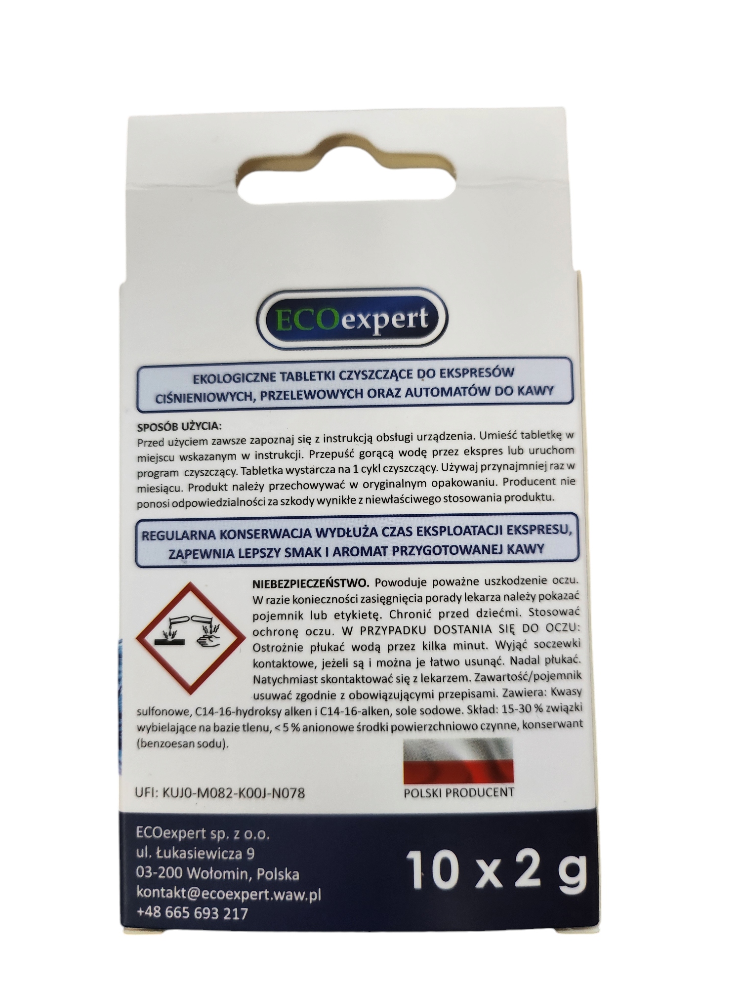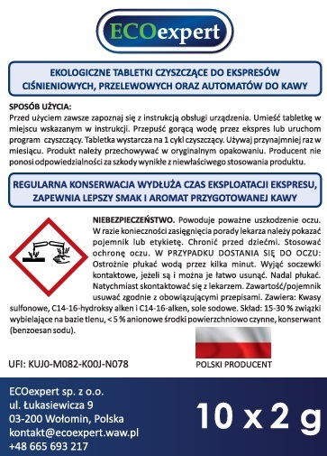 Sposób użycia: Przed użyciem należy przeczytać wskazówki producenta dotyczące czyszczenia urządzenia. Jedna tabletka wystarcza na jeden cykl czyszczący. Do czyszczenia niektórych modeli ekspresów należy przełamać tabletkę.